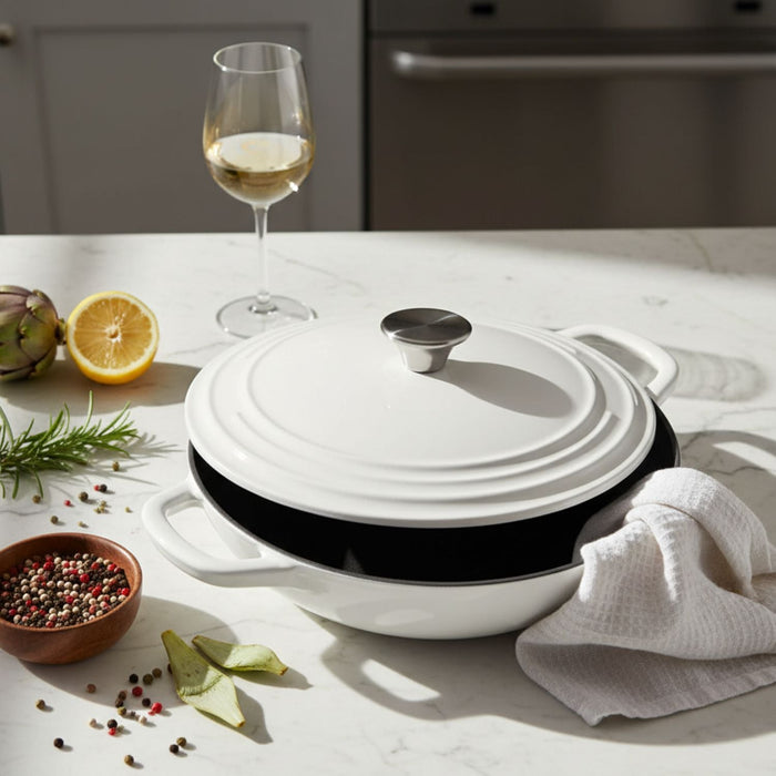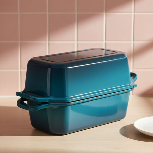Our enameled cast iron bread baker traps steam like a Dutch oven, so you get bakery-style loaves in your home oven – crisp crust, open crumb, no seasoning or rust to worry about.
